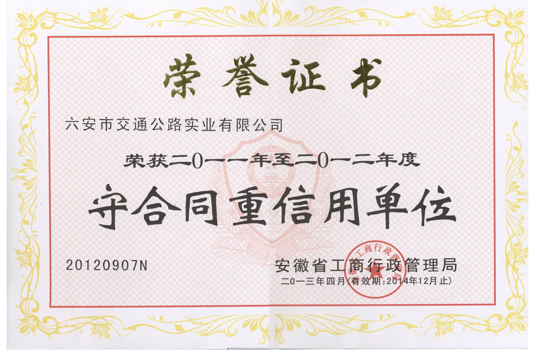 近日,六安市交通公路實(shí)業(yè)有限公司獲譽(yù)由安徽省工商行政管理局頒發(fā)的“守合同重信用”單位稱號(hào)。